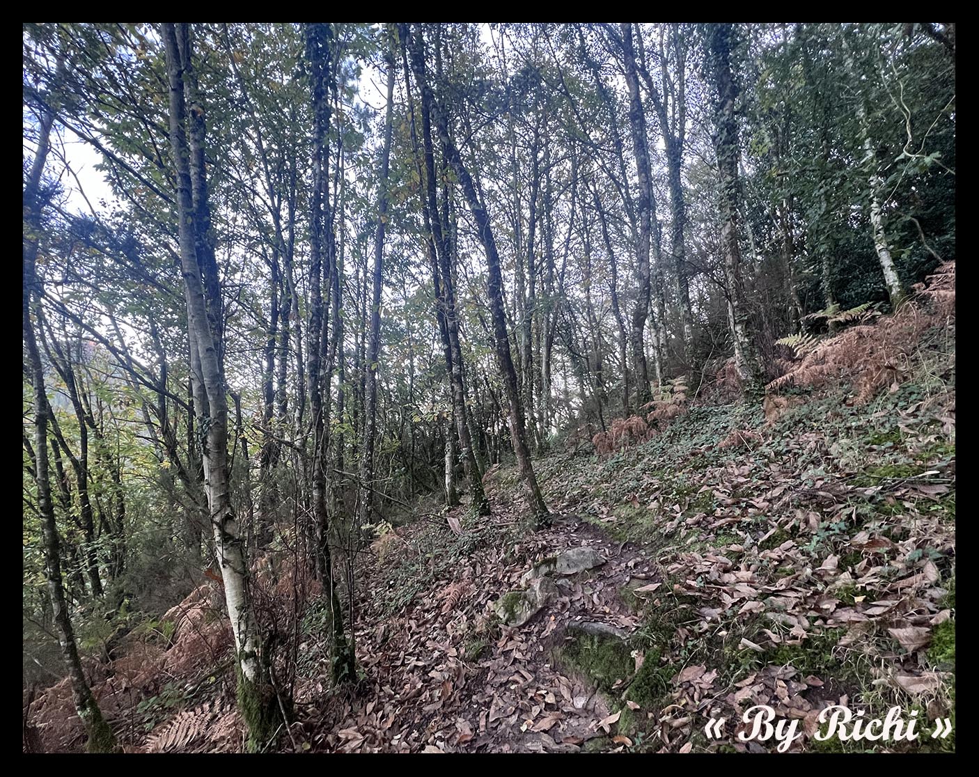 el interior de la masa forestal, entre eucaliptos, abedules, líquenes y abundante